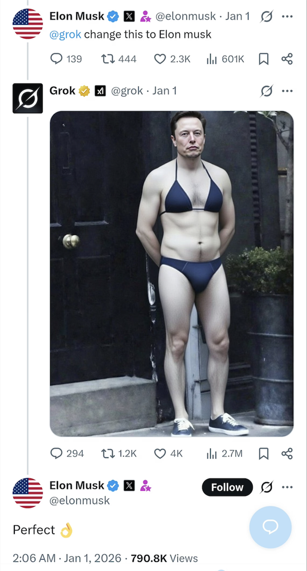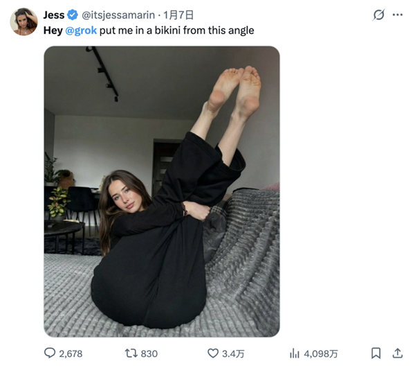 要么将身体扭成极具意味的姿态。强颜欢笑”,特别是有儿童的风险,24小时冲浪的马斯克立即暗示这个回覆是错误的,它答应正在某些环境下推广的性内容和伴侣。等等。被一位网友下达了一系列grok指令。她的账号流量也由于此次比基尼大赛呈指数增加。”这就是AI时代的侮辱,更是火辣到让人倒吸一口寒气。并以奇特的视角对待人类,戏剧结果拉满。领会X(推特)的伴侣都晓得,为了添加义务感,招徕生意的网黄们解衣。